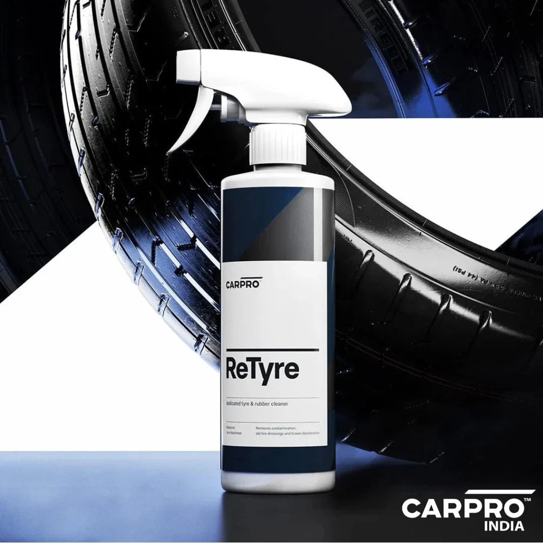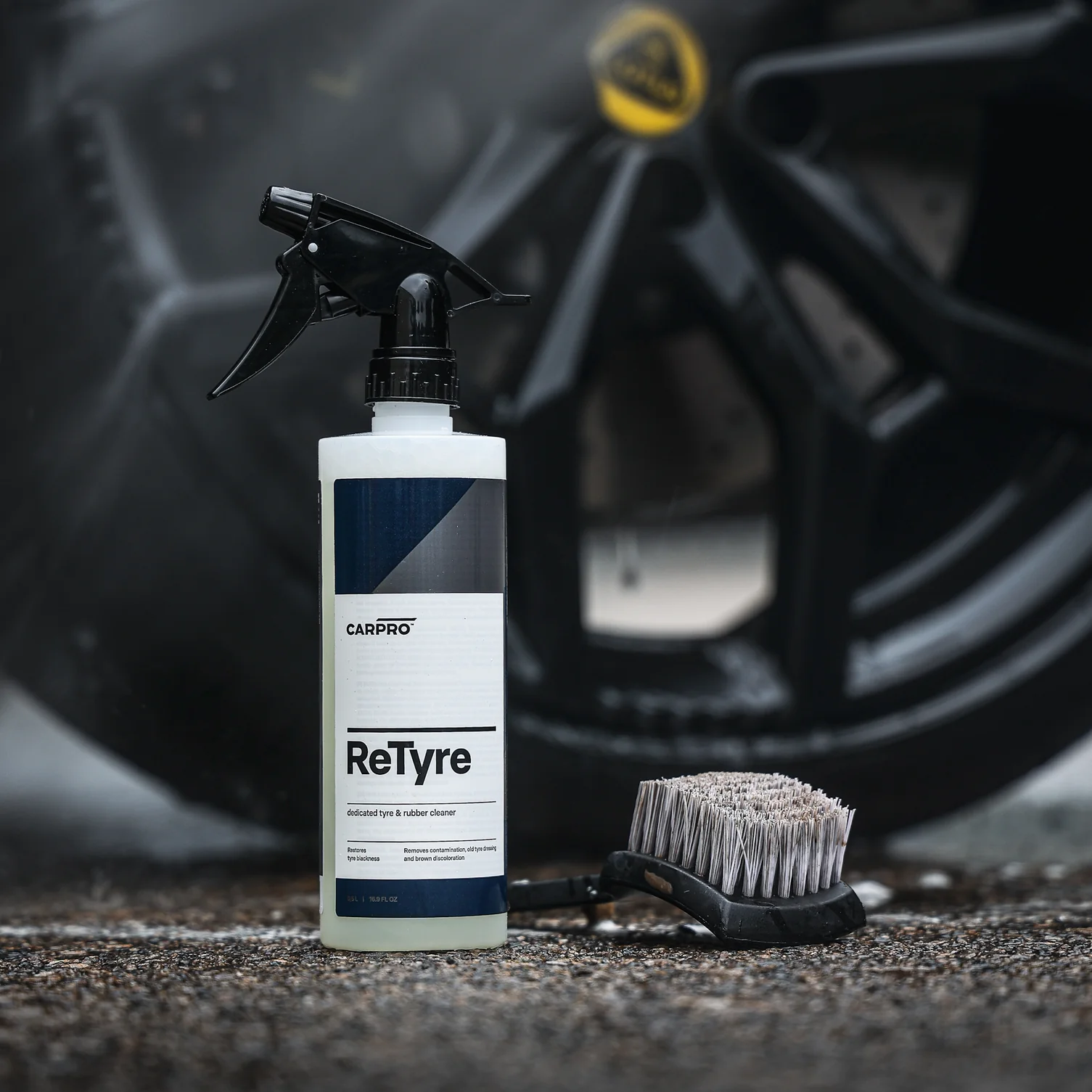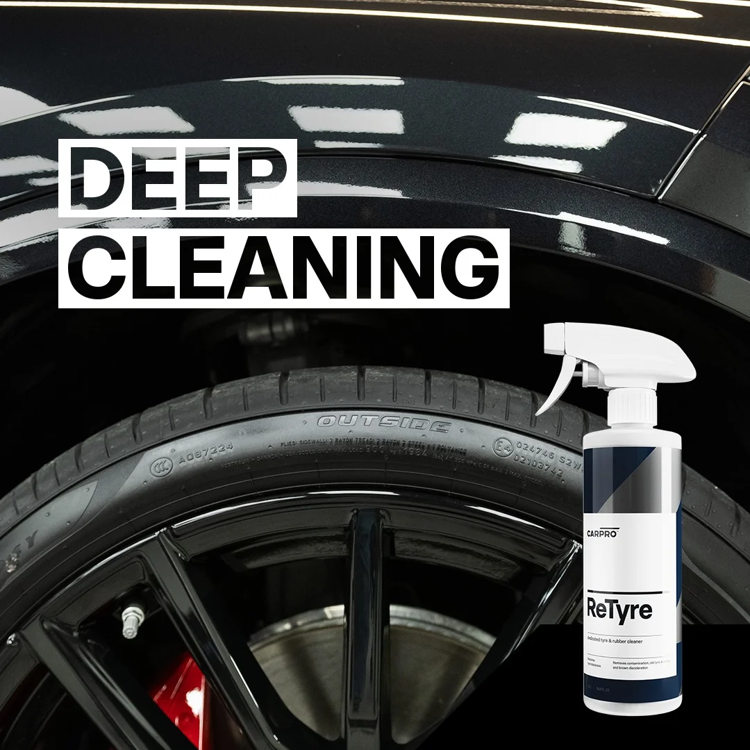 CarPro ReTyre was designed from the ground up specifically for the easy cleansing of tyres from accumulated tyre dressings, road film, and browning antioxidants. ReTyre from CarPro provides a sparkling clean new tyre look and prepares the surface to applyBlackOut, PERL or your favourite tyre sealant. Tyre sealants, coatings, and dressings respond much better to a perfectly clean tyre and in the case of CQuartz BlackOut, it is absolutely imperative for a full band!